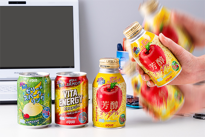 「ぷるっシュ!! ゼリー×スパークリング 芳醇アップル」、「ぷるっシュ!! ゼリー×スパークリング ビタエナジー」、「ぷるっシュ!! ゼリー×スパークリング メロンクリームソーダ」