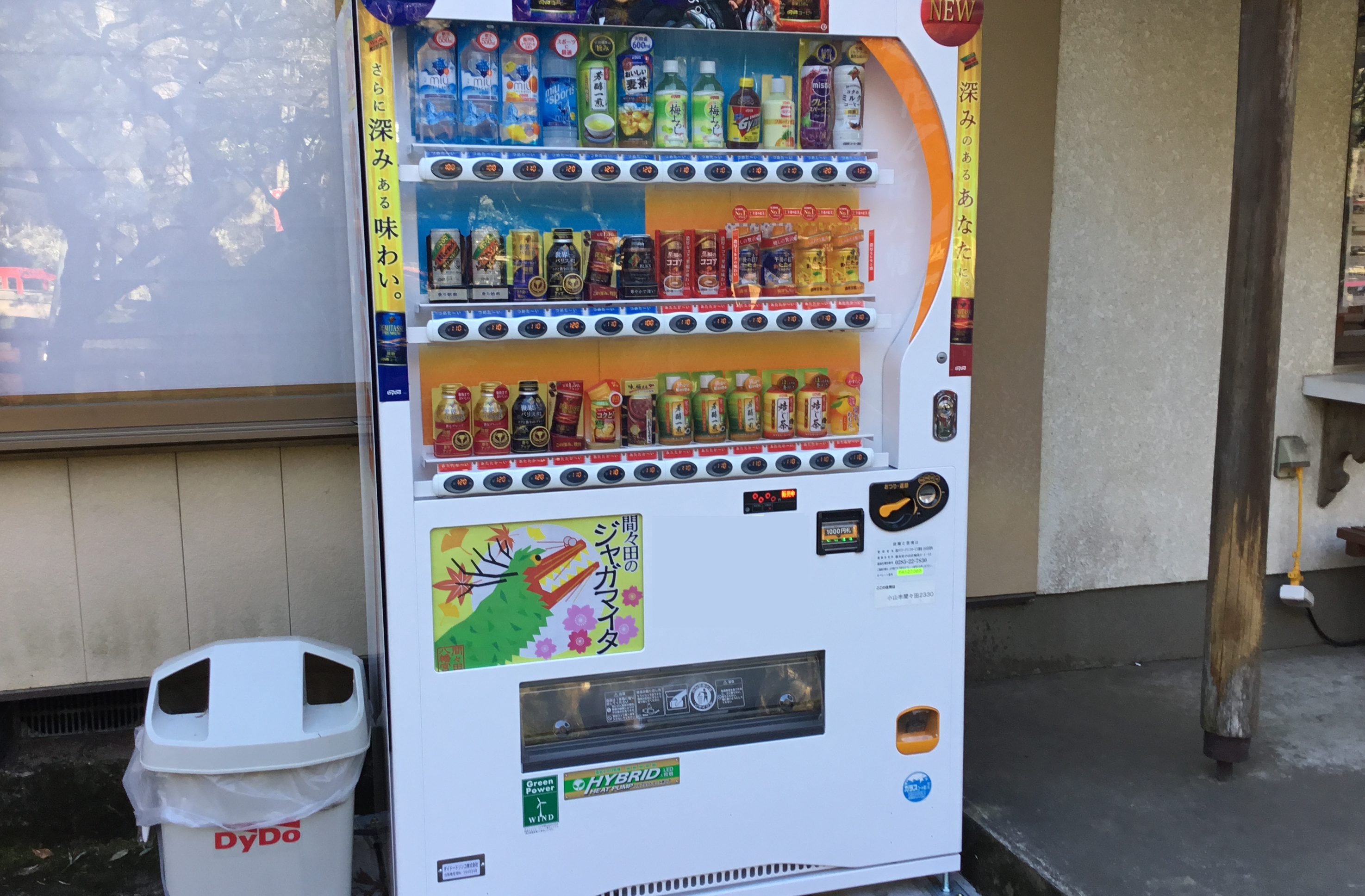 本自販機は飲料を購入して頂いたタイミングで、お祭り「間々田のジャガマイタ」の掛け声が流れる仕様(毎日7:00~17:00の間にご購入頂いた場合に発信)となっており、お祭り当日は実際の掛け声が迫力満点に境内に響き渡ります。