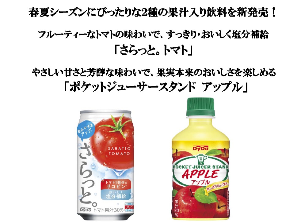 ダイドードリンコ株式会社は、2023年春夏の新商品として、「さらっと。トマト」、「ポケットジューサースタンド アップル」を2月27日(月)より発売いたします。